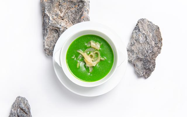 还有一道玻璃脆皮乳鸽也是经典。选用广东中山“石岐乳鸽”,18天-21天的小鸽骨软肉嫩。经过清水煲、卤水浸、上糖浆、风干、炸制等步骤,汁水丰盈,肉质鲜美,表皮酥脆,如玻璃般晶莹剔透。另一道食养蔬汁花胶也是潮汕传统味道。陈师傅使用独创蔬菜汁,以黄油鸡与猪肉吊高汤,加上嫩菠菜汁与荔浦芋头茸,汤汁碧绿,口感滑糯。
