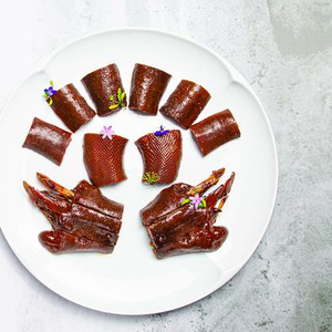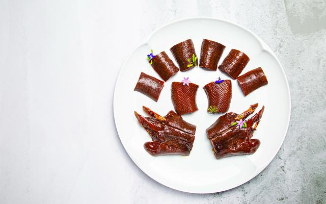 新菜单里的澄海·36个月狮头鹅鹅头不可错过。产自潮州地区饶平县的狮头鹅有“世界鹅王”的美称。据陈师傅介绍,一定要选择36个月的鹅,肉质紧实,富有嚼劲。卤水更是用足心思,以五年以上的黄油老鸡、猪筒骨等为底,配以火腿、瑶柱以及八角、桂皮、香叶等十余种香料老火慢熬。初入口鲜咸味浓,咀嚼后舌底回甘。