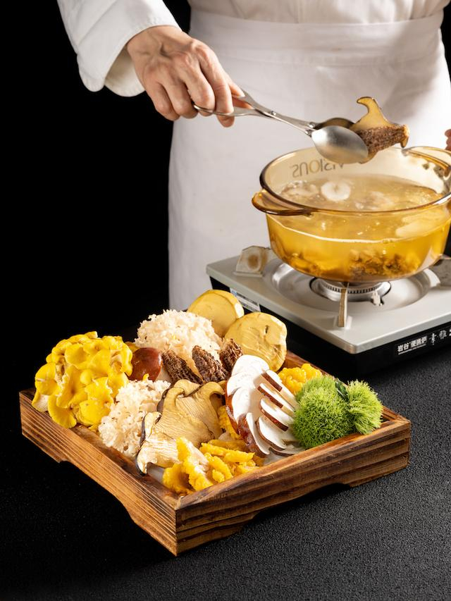 重头戏是现场烹制的云南揽山珍菌老鸡汤。据介绍,这道菜精选松茸、鸡油菌、羊肚菌等六种云南鲜菌,每周空运至餐厅。先将苏北草鸡去骨入汤,加黑猪肉和松茸片,纯水蒸制7小时;鸡汤上桌后,将六种云南鲜菌现场烹饪煮制,香气浓郁,入口醇厚鲜美。另外一道南京味道的花胶烩辽参也值得推荐,汤汁葱香浓郁,由主厨用五种不同的葱秘制而成,花胶与关东辽参经数小时慢火焖制,口感软糯。