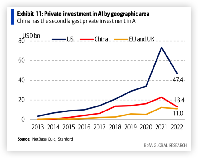 中国的AI投资从2013年的6亿美元上升到2021年的230亿美元,到2022年下降到134亿美元。中国一直是AI投资的第二大市场,在过去几年里占全球总投资的15-32%。