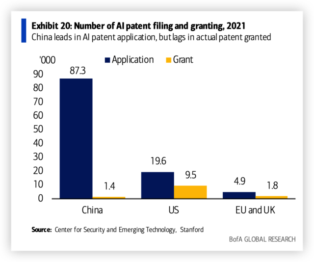 在专利方面,中国占了全球AI专利申请的一半以上,但获批专利仅占全球获批总数的6%。2021年,中国AI相关专利申请数量高达8.7万件,但仅有1400件获批,而美国在2021年提交了1.96万件专利申请,其中9500件获批,在全球各大经济体中数量最高。