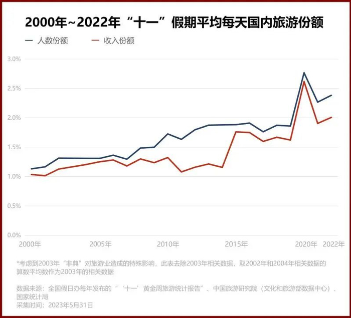 以“十一”黄金周为例,数据显示,自1999年我国历史上第一个黄金周出现以来,“十一”假期期间平均每天国内旅游人数份额和收入份额总体呈稳步上升的趋势。“十一”黄金周在全年365天中仅占1.92%,却有着平均10.08%的全年国内旅游收入份额。