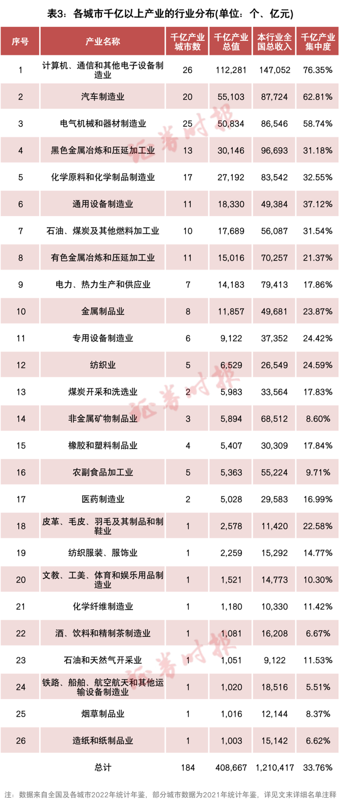 按照国家统计局的41个工业大类分类标准,62城的184个千亿产业可以归入26个行业(表3)。排名前五的行业分别是:计算机通信和其他电子设备制造业(简称“计算机通信电子业”)、汽车制造业、电气机械和器材制造业(简称“电气装备制造业”)、黑色金属冶炼和压延加工业(简称“钢铁行业”)、化学原料和化学制品制造业(简称“化学制造业”)。