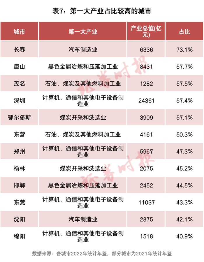 证券时报记者梳理发现,有12个城市的第一大产业占全市规上工业总值的比例超过40%(表7)。这些第一大产业占比较高的城市,大体可分为两类。一类是“一超多强型”,以深圳、东莞为代表;另一类是“单一产业支柱型”,以长春、唐山、鄂尔多斯为代表。