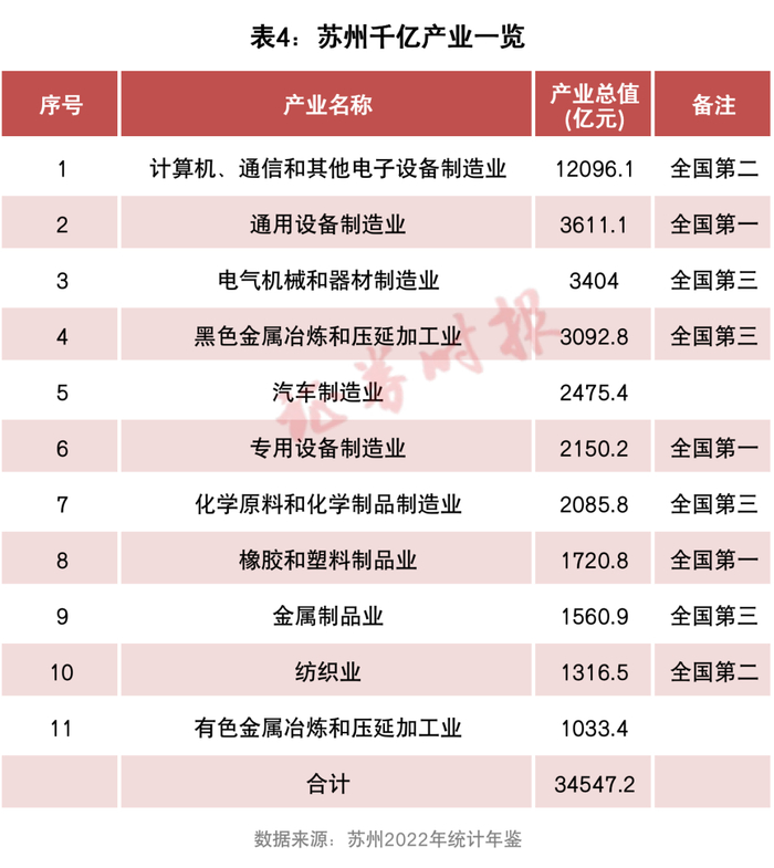 排名第一的苏州值得重点着墨。苏州拥有11个千亿产业,其中9个产业位居全国前三,3个产业(通用设备制造、专用设备制造、橡胶和塑料制品业)位于全国第一(表4)。此外,苏州还有2个准千亿产业——化学纤维制造业(986亿元)、非金属矿物制品业(913亿元)。无论传统工业还是新兴制造业,苏州皆有不俗表现,可谓全面优秀。