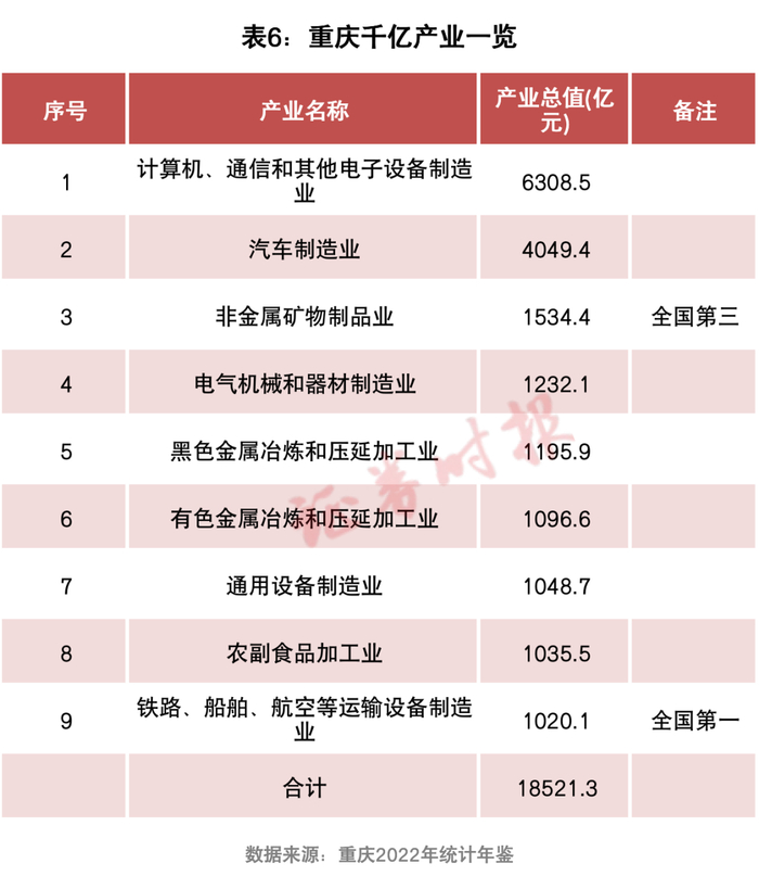 作为西部大开发的枢纽门户,重庆和四川分别拥有9个、5个千亿产业,总值分别为1.85万亿元、1.06万亿元。