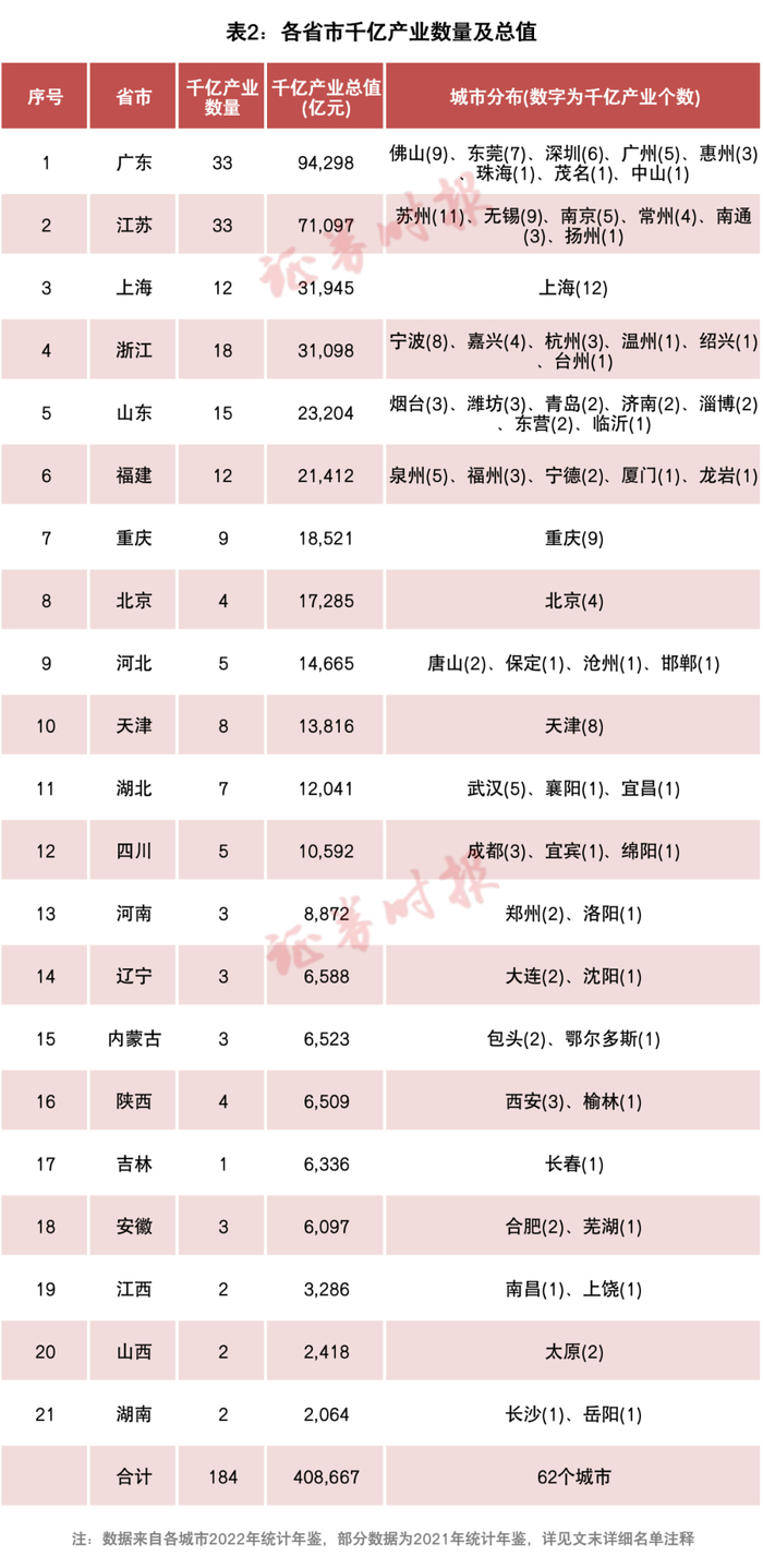 从地理分布来看,这62城的184个千亿产业分属于21个省级行政区(表2)。