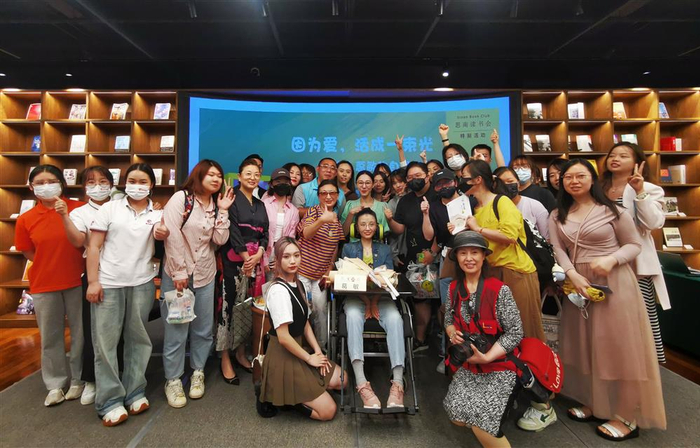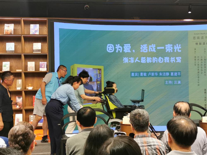 一个渐冻人上台,不能说话,该有多难受?两个多月前,得知思南读书会有意邀请葛敏来发布自己的新书,老读者许树建不禁担心。这天下午,前一场读书会结束,他到附近药房给爱人买了一盒药,很快赶回会场。一转身,就见一位女子推着轮椅车来到走廊。“轮椅上那位美丽的女士对着我笑”,许树建反应过来,是葛敏,下一场读者会的主角。轮椅车进门遇到门槛,他赶紧帮忙抬起后轮。