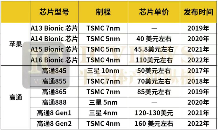 接下来再看苹果。在与高通的手机处理器售价对比中,苹果的处理器成本价格上调情况看似要“温和”得多,其2020年发布的A14 仿生芯片成本价格只有40美元左右,其最新发布的A16 仿生芯片也只有110美元,比高通足足低出50美元。