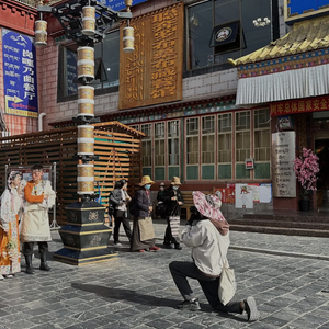 “微笑、背挺直,很美,3、2、1……”拉萨八廓街,摄影师斜挎装满道具的布包,游客身着藏服摆出各种动作。