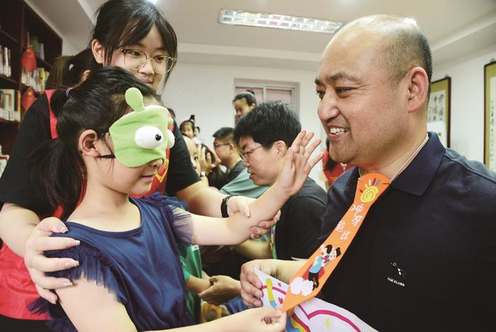 日前,金山街道风车山社区开展“感恩父亲节 萌娃送祝福”主题活动,志愿者带着小朋友为爸爸画像、制作创意领带,进行“蒙眼找爸爸”游戏,向爸爸表达父亲节的感恩与祝福。石玉成 摄影报道