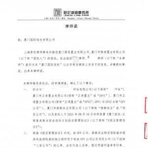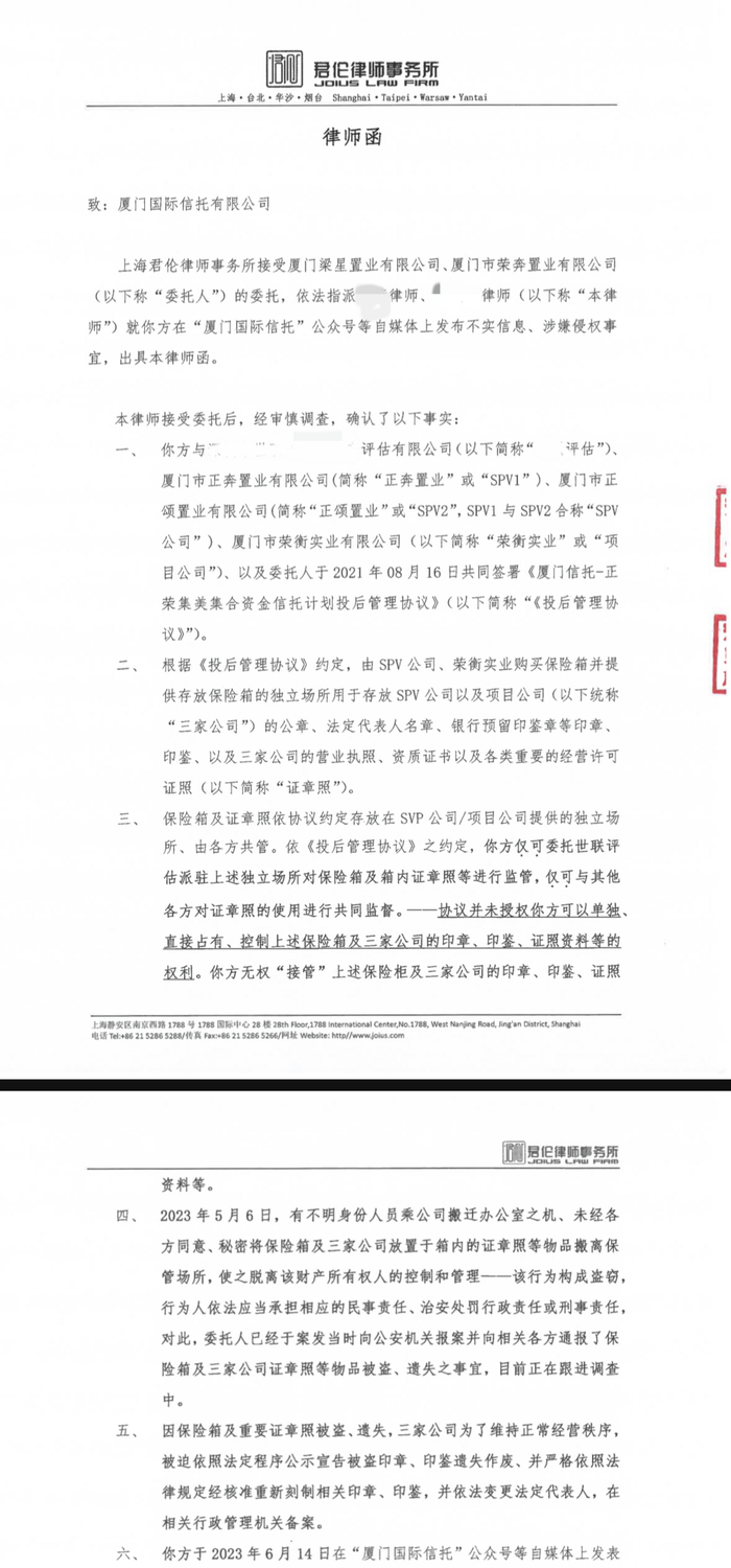 针对厦门国际信托就公章、法人变更等事项发出的严正声明,厦门荣奔置业及厦门梁星置业,委托上海君伦律师事务所于6月20日,向厦门国际信托发出了律师函。