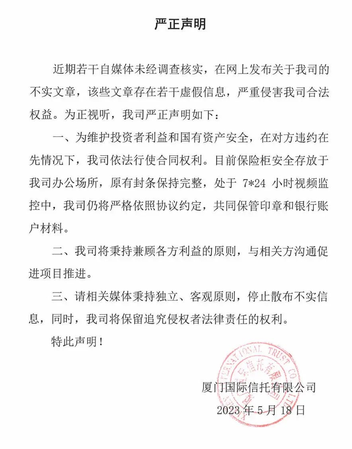 此前于6月14日,厦门国际信托发布了一则严正声明。