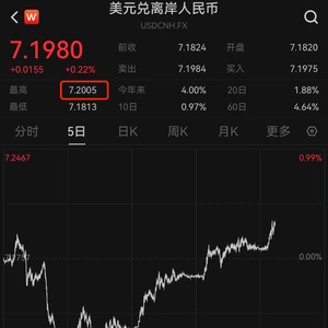 今天(6月21日)一早,离岸人民币对美元汇率盘中一度跌破7.20关口,为去年11月末以来首次。