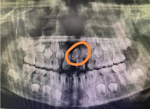 小朋友家长,这是刚拍好的片子,请看这个地方,是因为长了多生牙才影响了正常恒牙的位置,导致两颗牙齿之间的间隙过大。