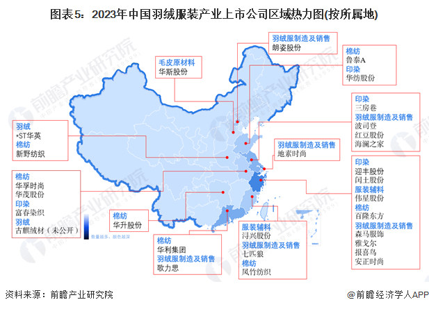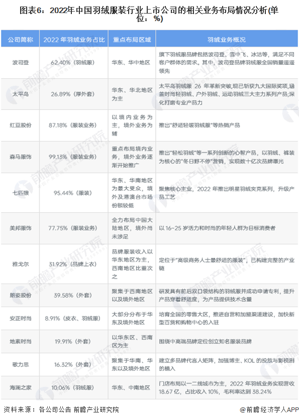 从我国羽绒服装上市企业的羽绒服装业务布局情况来看,部分企业采用羽绒服装组合其他品类服饰的销售模式以拓宽对消费者的覆盖面,大部分品牌定位从中低端到高奢系列均有涉及,我国服饰行业已形成布局分工较为成熟的产业链。从区域分布来看,以华东地区为主要集中地。