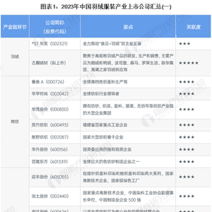 羽绒服装制造是我国纺织服装、服饰业的重要组成部分。目前,我国羽绒服装产业的上市公司数量较多,分布在各产业链环节。其中,涉及羽绒服装产业链的上市公司包括:波司登、森马股份、华孚时尚等。