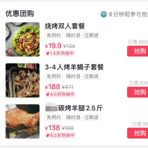 同样以我所在的北京某商圈为例,烧烤可以说是今年开店最猛的品类,新店开业的双人套餐基本都是“三折起”,最低的甚至去到1.5折,吃一顿烧烤比吃一碗面还便宜,妥妥地打到了“骨折”。