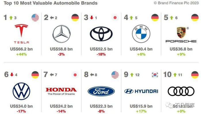 这不,前不久英国品牌评估机构“品牌金融”(Brand Finance)发布了《2023年汽车行业报告》,公布了“2023年全球最有价值100个汽车品牌”榜单,榜单显示,2023年世界最具价值的五大汽车品牌分别是:特斯拉、梅赛德斯-奔驰、丰田、宝马和保时捷。