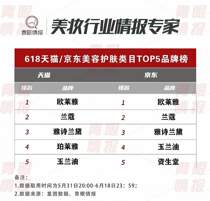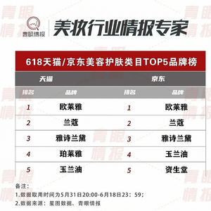 值得一提的是,天猫、京东美容护肤类目TOP5品牌前三排名无差别,均依次为欧莱雅、兰蔻、雅诗兰黛。