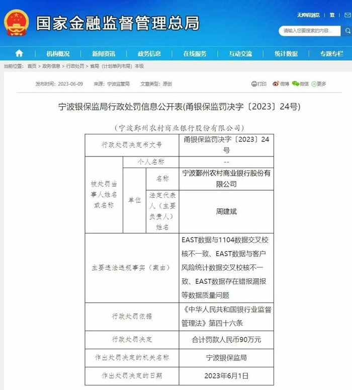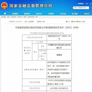 行政处罚决定书文号:甬银保监罚决字〔2023〕24号,案由:宁波鄞州农村商业银行因存在“EAST数据与1104数据交叉校核不一致、EAST数据与客户风险统计数据交叉校核不一致、EAST数据存在错报漏报等数据质量问题”等违法违规事实,依据《中华人民共和国银行业监督管理法》第四十六条,被宁波银保监局处罚90万元。