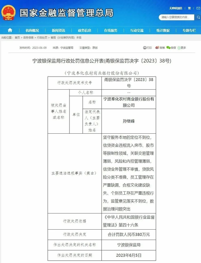 就在鄞州农商被处罚的同一天,宁波银保监局又出手了,宁波奉化农村商业银行的罚单也涉及“数据治理问题”。因宁波奉化农村商业银行的罚单也涉及“数据治理问题”。因“坚守服务本地的定位不到位,信贷资金违规流入房市、股市等限制性领域,关联交易管理薄弱,风险和内控管理薄弱,信贷业务管理不审慎,贷款风险分类不准确,员工管理存在严重缺漏,合规文化建设缺失、个别员工存在严重违规行为,监管意见落实不到位,数据治理问题突出”等多项主要违法违规事实,依据《中华人民共和国银行业监督管理法》第四十六条,被宁波银保监局合计罚款380万元。