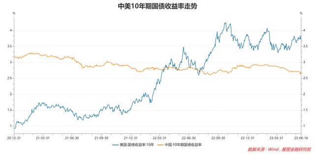 以10年期国债收益率为例,2021年至今,美债收益率从最低0.93%涨至最高4.25%,当前在3.7%附近震荡;而中债收益率则从最高3.29%跌至最低2.61%,当前在2.7%附近震荡。
