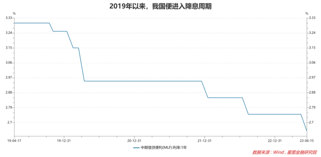 其实,自2019年Q4以来,我国一直处于降息周期中。MLF是核心的政策利率工具,也是LPR调整的核心驱动因素。2019Q4以来,1年期中期借贷便利MLF利率便进入下降通道,从3.3%降至2.65%。
