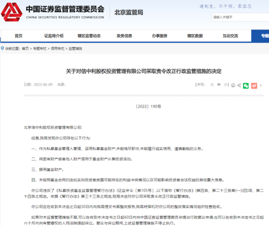 6月9日,信中利被北京证监局采取责令改正行政监管措施,北京证监局表示,信中利作为私募基金管理人,管理、运用私募基金财产未能恪尽职守,未能履行诚实信用、谨慎勤勉的义务。同时,信中利将固有财产或者他人财产混同于基金财产从事投资活动,挪用基金财产,未按照基金合同约定如实向投资者披露可能存在的利益冲突情况以及可能影响投资者合法权益的其他重大信息。