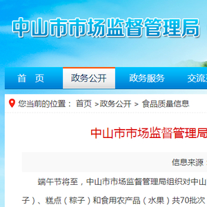 端午节将至,中山市市场监督管理局组织对中山市范围内食品生产经营环节的节令食品进行监督抽检,具体包括餐饮食品(自制粽子)、糕点(粽子)和食用农产品(水果)共70批次,合格样品69批次,不合格样品1批次。检验依据按照《广东省食品安全监督抽检实施细则》执行。