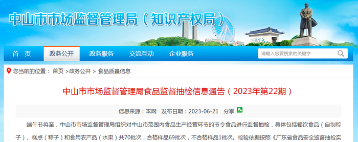 广东省中山市市场监管局抽检食品70批次 不合格1批次