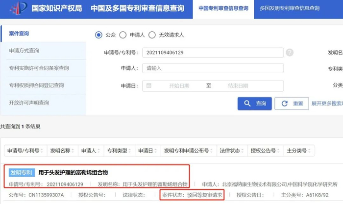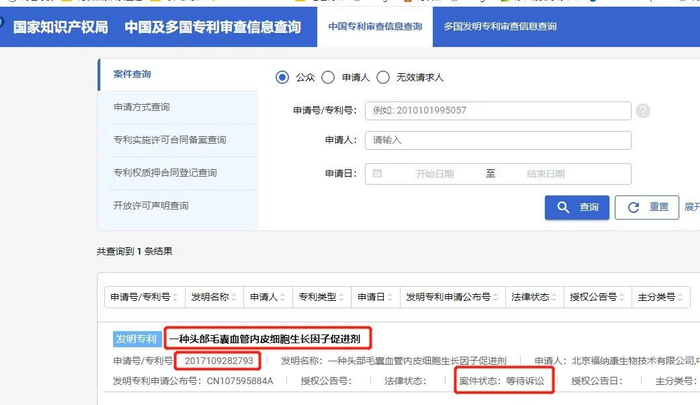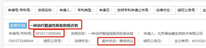 未央还提到,王春儒团队于2016年申请的一项“一种治疗脂溢性脱发的组合物”(申请号2016111555506)专利,目前也是处于“等待诉讼”的阶段,一般表示复审维持驳回。“一般从专利申请到获得授权的时间在两到三年左右,过了这么长时间得到授权的可能性比较低。”