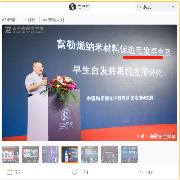 任泽平发布的微博配图也显示,在某公开活动现场,中国科学院化学研究所王春儒研究员正在进行以“富勒烯纳米材料促进毛发再生及早生白发转黑的应用研究”为题的演讲。
