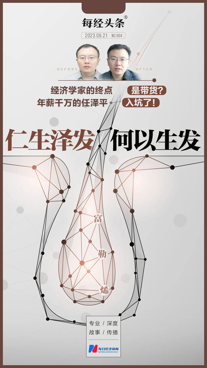 此前的6月15日晚,任泽平还开启了一场直播,直播的主角就是“仁生泽发”系列产品。在直播中,他展示着自己使用产品前后的大幅对比照。虽然任泽平一直避免使用“生发”“防脱发”这样的提法,但他提到,“男同志头发少了显老,一些90后、00后也开始头发变少……我一朋友给他孩子买,因为他儿子也是年纪轻轻头发就不好了,用了两三个月以后明显改善。”“有人问能让头发变得浓密吗,大家看我使用前后对比就知道了……你这样用3个月到5个月以后就变好了。”