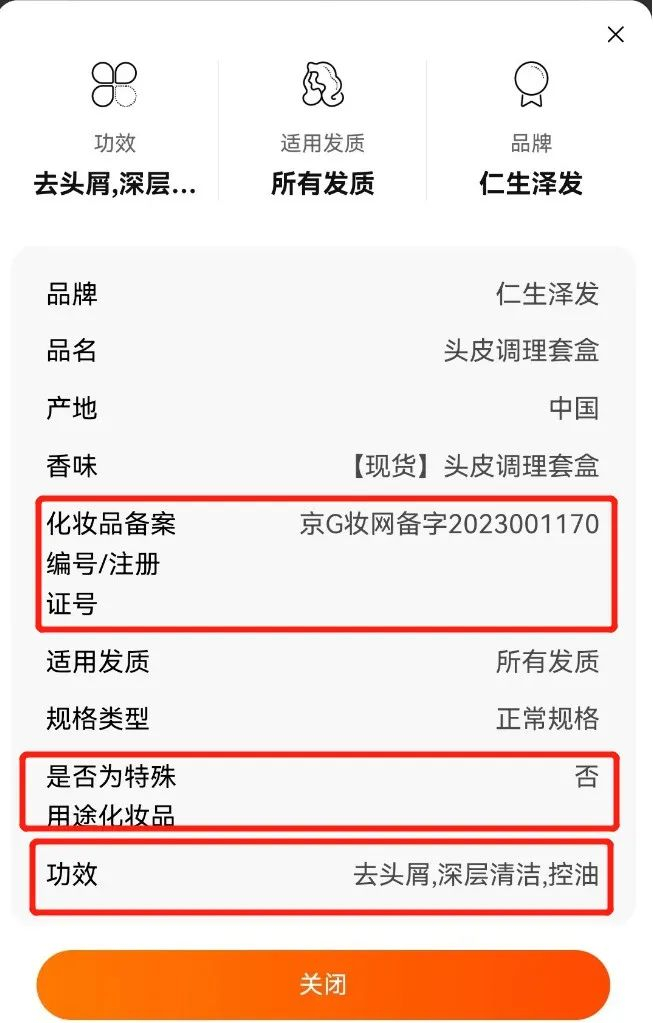 值得注意的是,“仁生泽发”上述两款产品的备案编号分别为京G妆网备字2023001170和京G妆网备字2023001171。按《化妆品卫生监督条例》第10条规定:生产特殊用途的化妆品,必须经国务院化妆品监督管理部门批准,取得批准文号后方可生产。特殊用途化妆品是指用于育发、染发、烫发、脱毛、美乳、健美、除臭、祛斑、防晒的化妆品。
