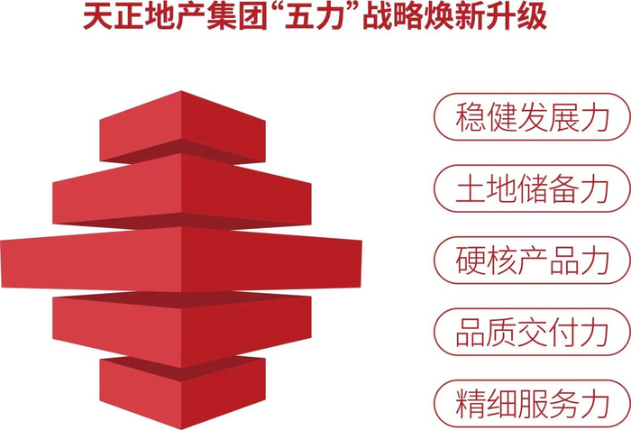 以企业定位与品牌战略为引领,近年来,天正地产集团焕新升级“五力”运营战略,针对发展力、土储力、产品力、交付力、服务力等五大内容进行全维度升级迭新,赋能品牌新生,不断为企业发展注入新的发展活力与生命力。