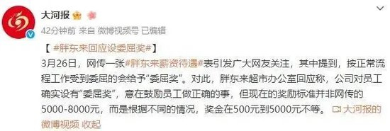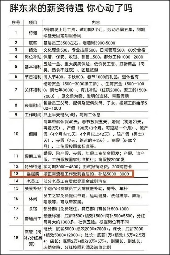 今年3月,胖东来曾登上微博热搜榜第一。起源是网传一张胖东来薪资待遇表:胖东来员工一天工作6小时,每周二休息,有40天带薪年假,如果按正常流程工作受到委屈,胖东来还会给予“委屈奖”,引发网友热议。