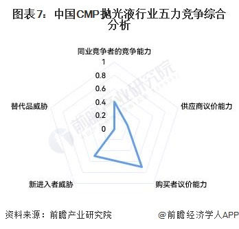 从五力竞争模型角度分析,CMP抛光液上游主要为研磨颗粒、分散剂、氧化剂等原材料,其中研磨颗粒是CMP抛光液上游的核心原材料,过去几年被国外的企业垄断,但随着中国企业技术的发展,部分企业实现了研磨粒子的自主制备。从下游应用领域来看,CMP抛光液广泛应用于集成电路、分立器件、光电子器件、传感器等产业,近年来这些产业发展迅速,对CMP抛光液需求大,不同领域使用的CMP抛光液产品差异较大,产品同质化程度一般。CMP抛光液行业壁垒较高,目前CMP抛光液市场主要由国外企业占领,国内参与者较少,但产品毛利率水平较高,行业吸引力较强。根据以上分析,对各方面的竞争情况进行量化,1代表最大,0代表最小,目前我国CMP抛光液行业五力竞争总结如下: