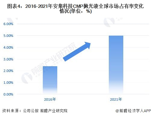 安集科技作为中国CMP抛光液行业的龙头企业,近几年在国际市场的竞争地位不断提升,公司成功打破了国外厂商对集成电路领域化学机械抛光液的垄断,实现了进口替代,使中国在该领域拥有了自主供应能力。根据安集科技公布的资料,2016年安集科技CMP抛光液的市场占有率仅2.4%左右,2021年上升至5%左右,成功跻身国际CMP抛光液市场前列。