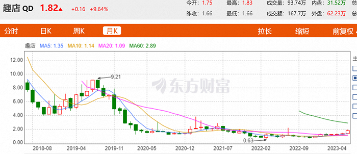 在财报发布后,趣店的股价当日上涨5%,13日1.94美元的股价还成为近两年新高,和0.64美元的低位股价相比涨幅超过200%。但是趣店依然没有回到往日辉煌时刻,最高时股价为9.21美元,截至目前股价已经下跌近八成,市值仅为4.1亿美元。