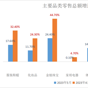 具体来看,从4月到5月,在商品零售的各个品类中,金银珠宝和服装鞋帽两个品类的增速表现*,而在2022年表现上佳的粮油食品、饮料品类,增速表现远远低于商品零售总额大盘。