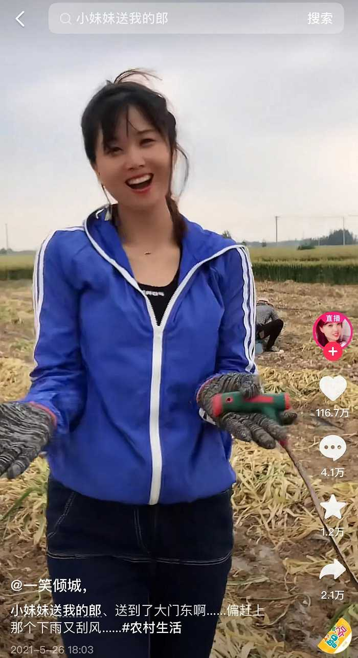 一笑倾城是来自山东菏泽的农村女孩,年龄33岁。自2019年4月12日开始发抖音,第一个对口型作品就火了。据抖查查,其男性用户占比76.26%,41-50岁占比34.20%。