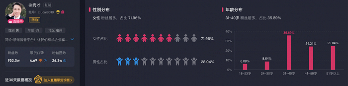 从粉丝画像可以看出,秀才有71.96%的女粉,其中31-40岁的占比最大达35.89%。其直播带货的主要消费人群为“都市银发”(44.44%)和“小镇中老年”(35.43%)。退休金杀手诚不我欺!