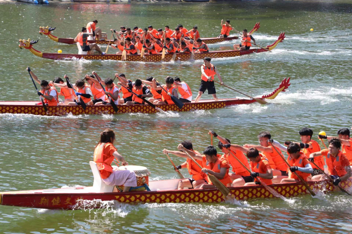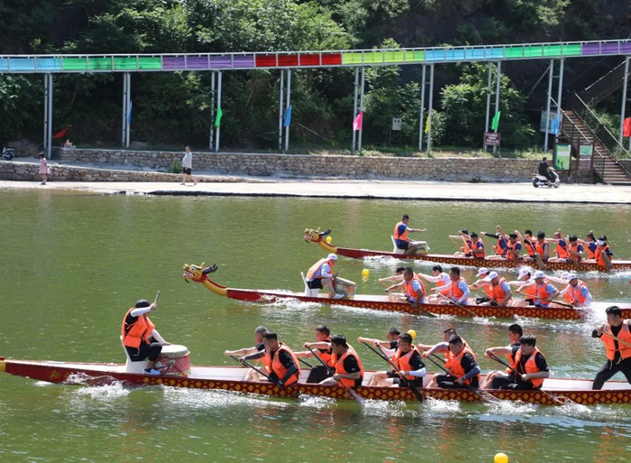 6月22日端午节,秦皇岛市海港区老君顶景区内锣鼓喧天,彩旗飘扬,秦皇岛第九届龙舟大赛在这里举行。伴随着鼓声,队员们手起桨落,龙舟飞速前进,岸边观众的加油声和呐喊声一浪接一浪。