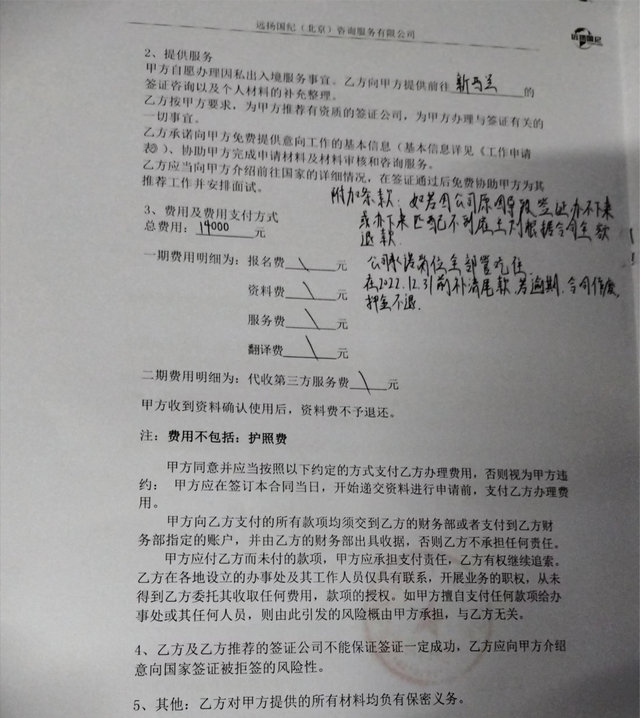 为了保障自己的权益,郑涛要求对方补充了手写的“附加条款”,若因为公司原因导致签证办不下来或办下来匹配不到雇主,公司根据合同全额退款;公司承诺岗位全部管吃住。
