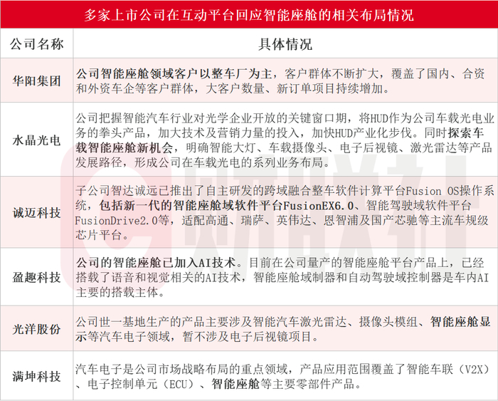 除了中科创达,近期,华阳集团、水晶光电、诚迈科技、盈趣科技、光洋股份、满坤科技等多家A股上市公司在互动平台回应智能座舱的相关布局情况,具体如下: