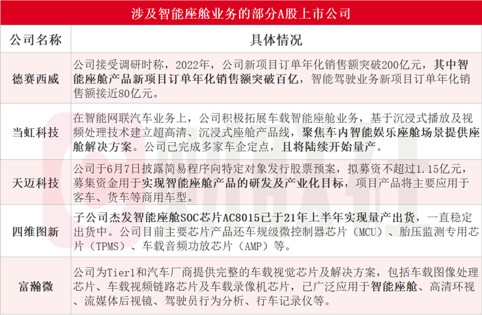 据财联社不完全统计,除了上述公司外,涉及智能座舱业务的A股上市公司还包括当虹科技、德赛西威、天迈科技、四维图新、富瀚微等,具体情况如下: