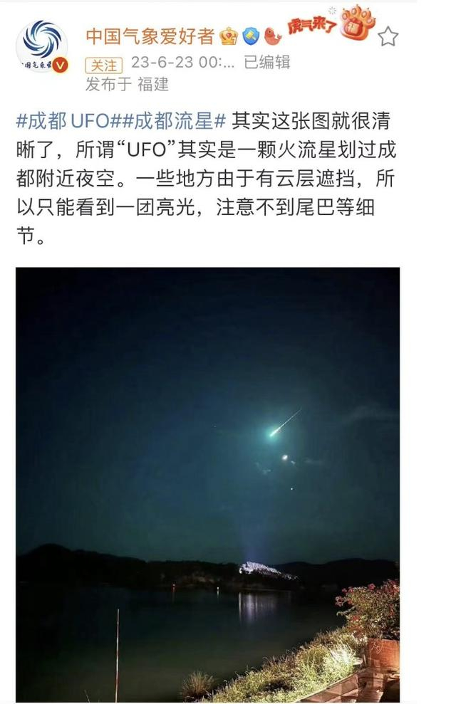 今天凌晨,知名科普博主@中国气象爱好者发文称,所谓“UFO”其实是一颗火流星划过成都附近夜空。一些地方由于有云层遮挡,所以只能看到一团亮光,注意不到尾巴等细节。