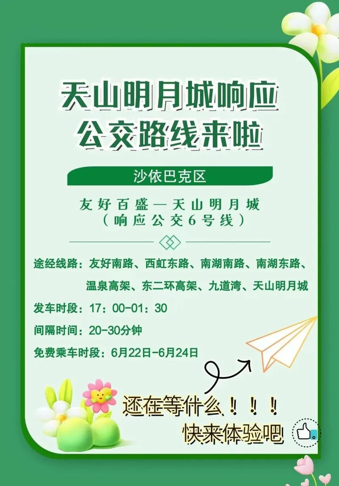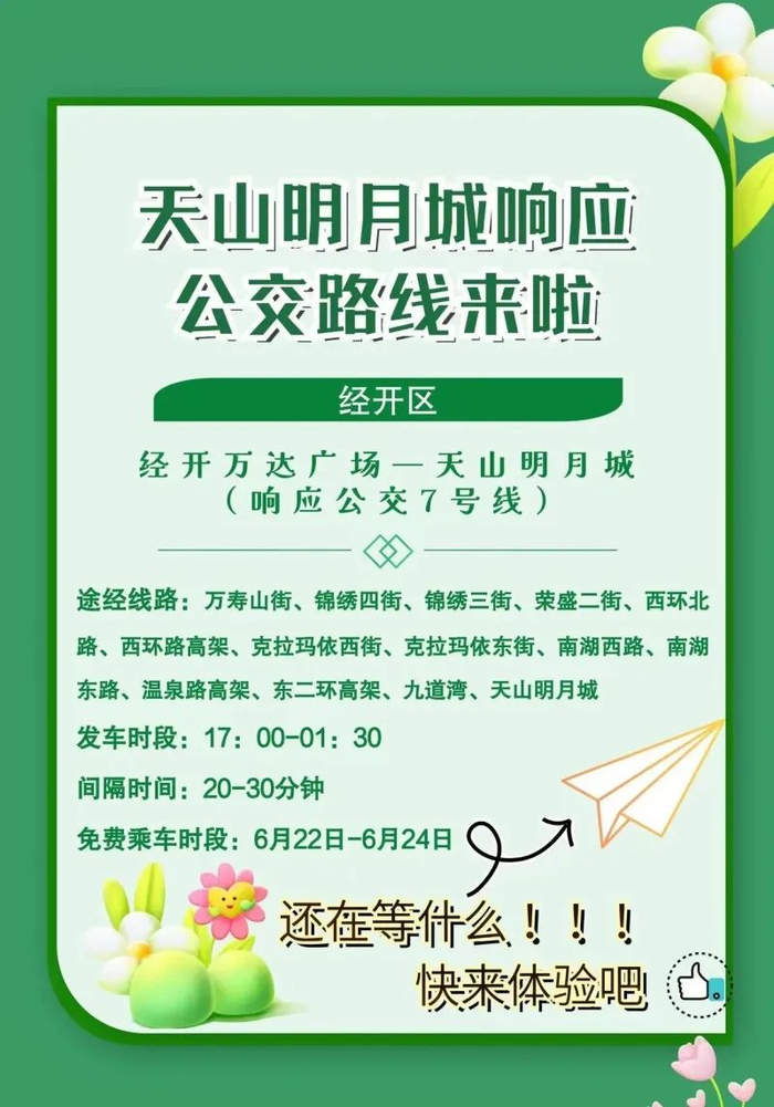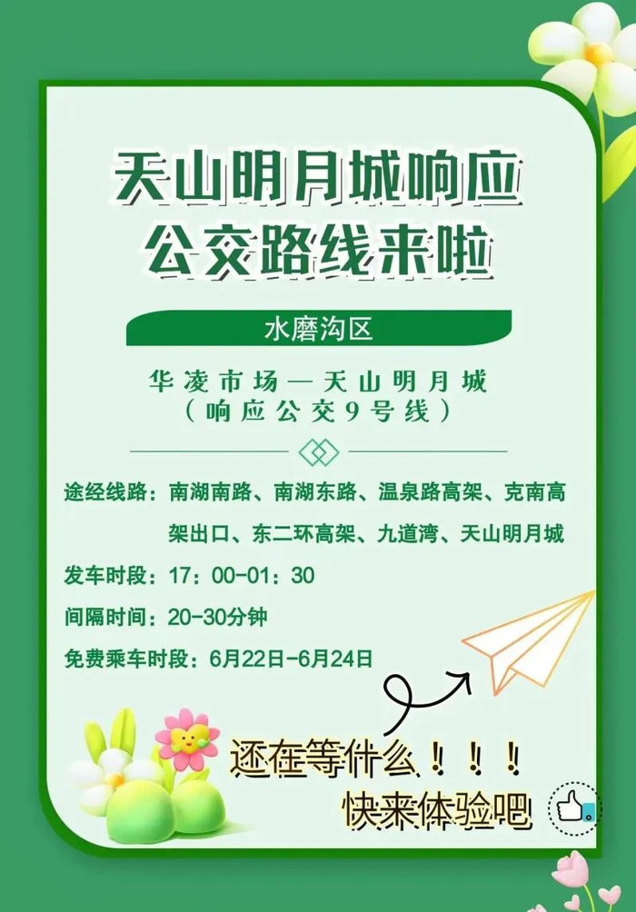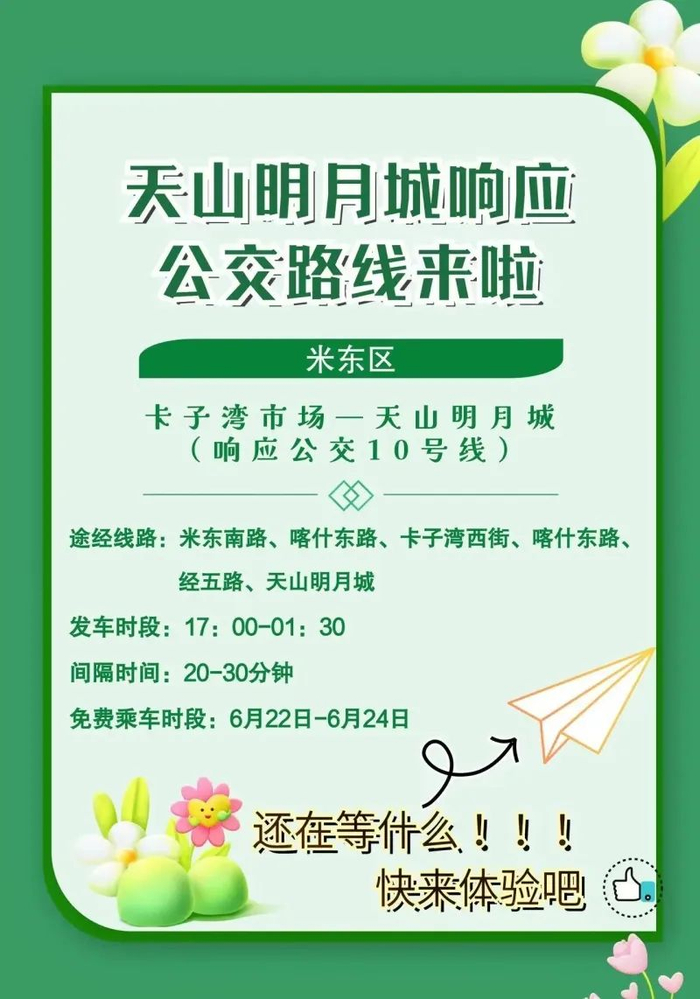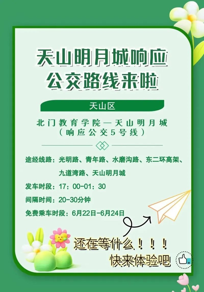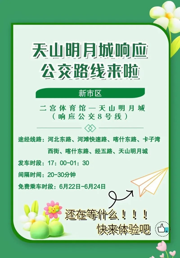 天山明月城地处乌鲁木齐市水磨沟区腾汇三路537号,市民可自驾前往,也可乘坐公交专线。为方便市民出行,乌鲁木齐市公交集团开通了天山明月城响应公交5号、6号、7号、8号、9号、10号公交专线。6月22日17时第一班车正式通行,22日—24日期间免费。