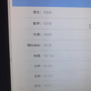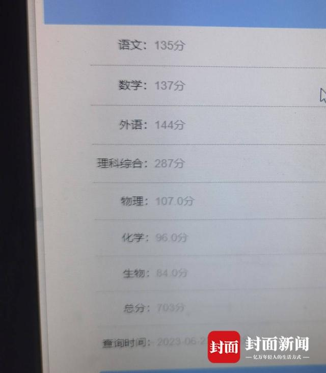 6月23日晚,绵阳中学2020级2班学生苟左,查询到了自己的高考分数。其中语文135分,数学137分,英语144分,理科综合287分,总分703分。